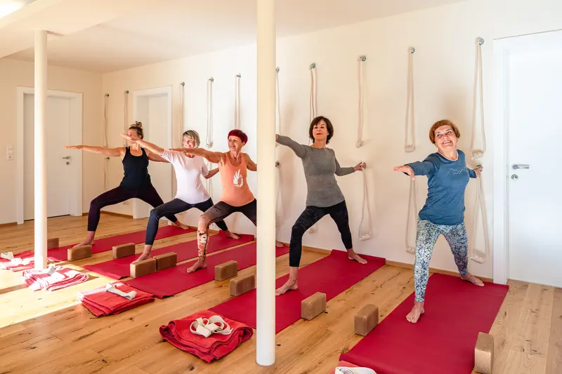 Neu eingestiegen oder fortgeschritten – Die yogamood-Praxis bietet durch die Individualität und die Nutzung von Hilfsmitteln wie Seilen, Stühlen, Polstern und Blöcken für jeden eine intensive Yogapraxis. Langjährige Unterrichtserfahrung mit vielfältiger Expertise auch aus der Sportwissenschaft und Forschung ermöglicht sogar Yogatherapie.